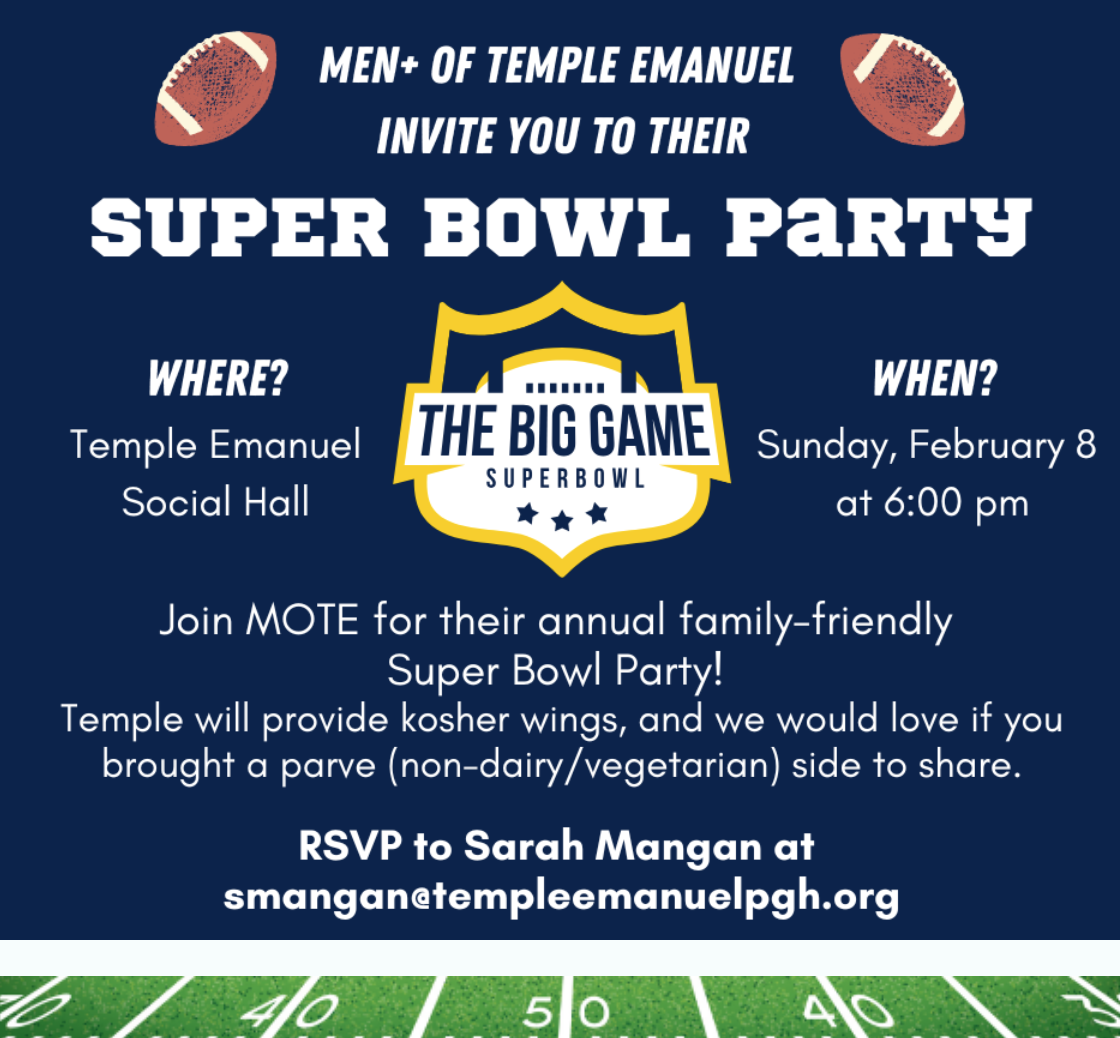 All are invited to join us at Temple Emanuel for our family-friendly Annual Super Bowl Party! Temple will provide kosher wings, Men+ of Temple Emanuel will provide the drinks, and […]