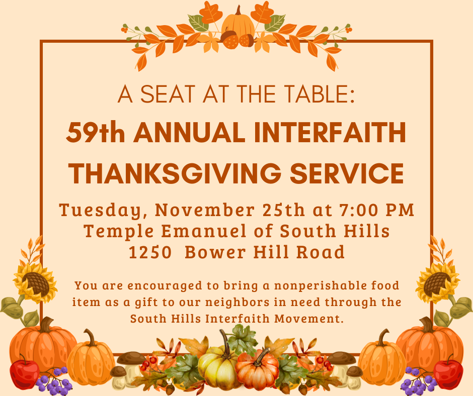 You are encouraged to bring a nonperishable food item as a gift to our neighbors in need through the South Hills Interfaith Movement.