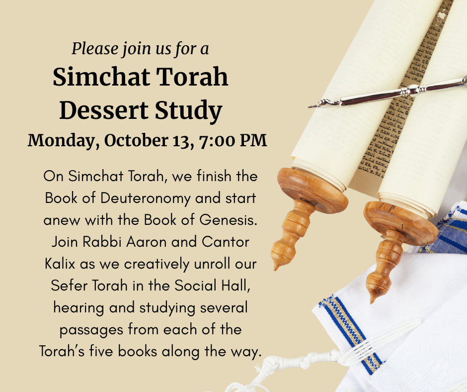 On Simchat Torah, we finish the Book of Deuteronomy and start anew with the Book of Genesis. Join Rabbi Aaron and Cantor Kalix as we creatively unroll our Sefer Torah in the Social Hall, hearing and studying several passages from each of the Torah’s five books along the way. Desserts provided.